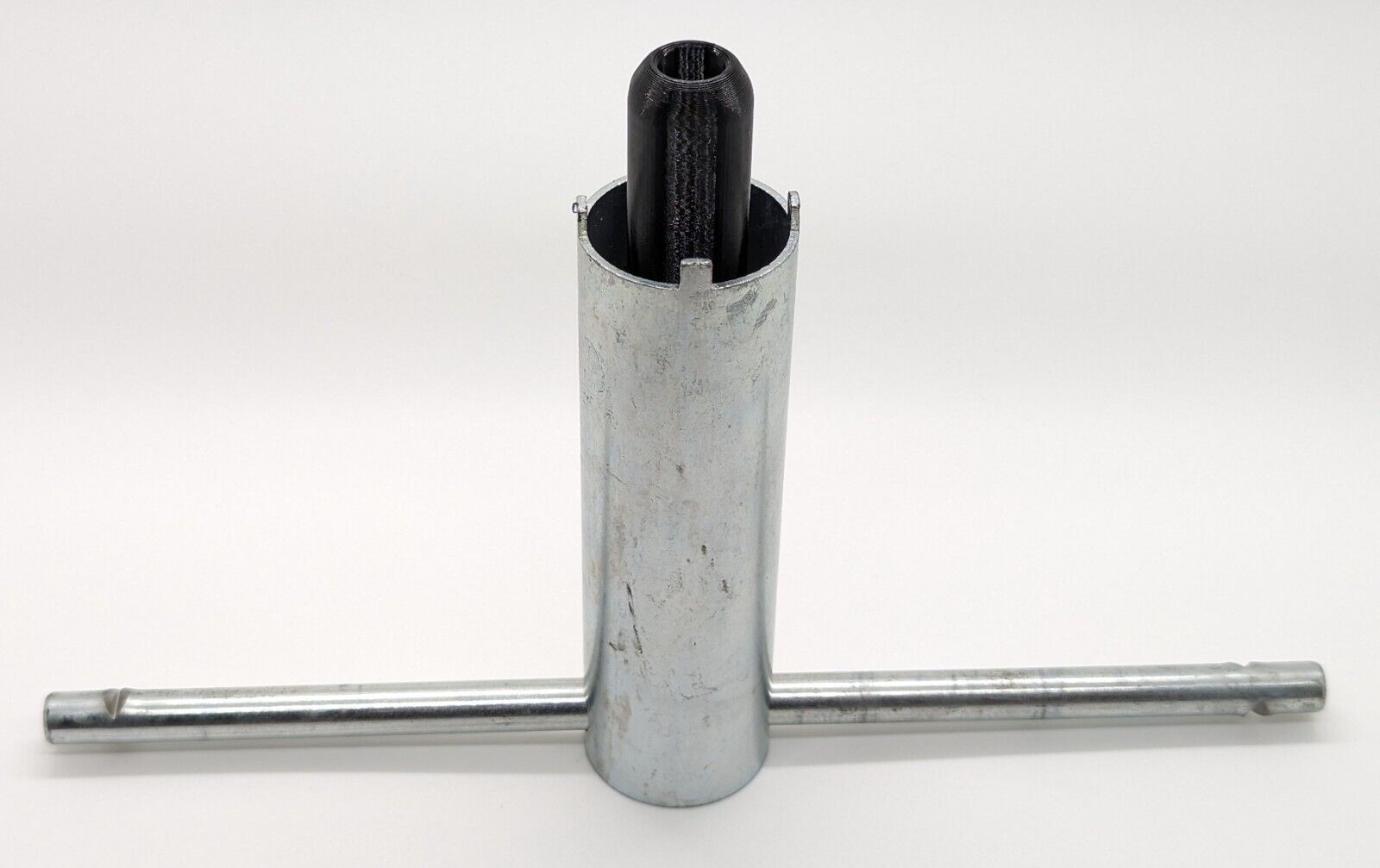 Plast styrning som passar i verktyget till att lossa mutter på spindeln fram.