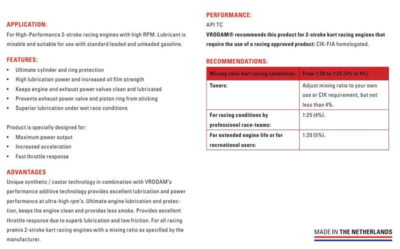 High performance 2-stroke kart racing engine oil based on castor and synthetic components including VROOAM’s additive performance technology.